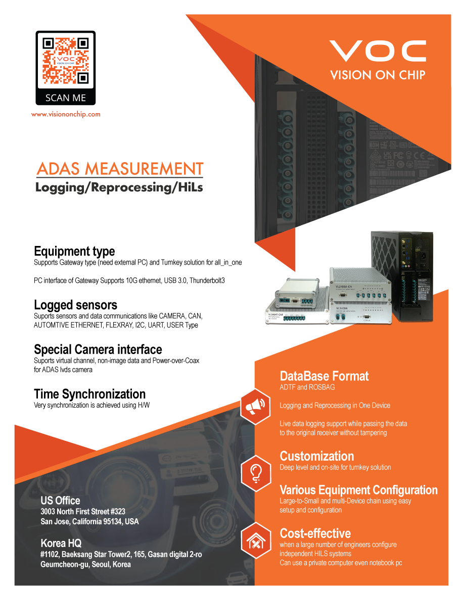 ADAS M/A system is necessary for the development and testing of vision AI systems (including autonomous system(s)). It functions by logging, reprocessing, HiLs and analysis of sensor data and network data for vehicles. Our product meet the perfect HiLs condition without loss of data thorugh a sophisticated synchronization (minimum 12.8 ns) between data.